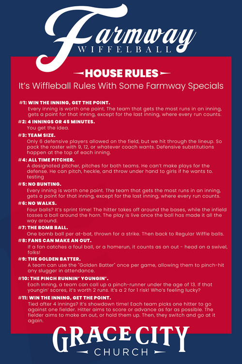 What would The Family Capital of the World be without a backyard for the family to play? That’s exactly why we built Farmway Park - the wiffleball field of dreams. The back patio is the place you want to be, whether at sundown on a Thursday night, or a pick-up game after Sunday service. Head on back. We’ll see ya on the field.